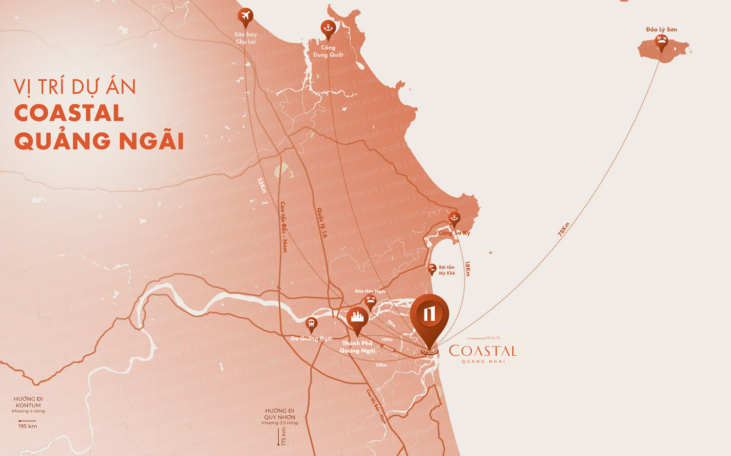Từ Coastal, chỉ trong ít phút di chuyển là chạm tới trung tâm thành phố Quảng Ngãi nơi tập trung hệ thống hành chính, giáo dục và dịch vụ của toàn tỉnh. Các trục giao thông huyết mạch kết nối nhanh chóng đến những khu du lịch biển, khu kinh tế và vùng phụ cận, mở ra một mạng lưới giao thương và phát triển liên tục. Vị trí ấy giúp Coastal vừa giữ được khoảng lặng riêng tư của một đô thị sinh thái ven sôngn ven biển, vừa không tách rời nhịp sống năng động của thành phố.